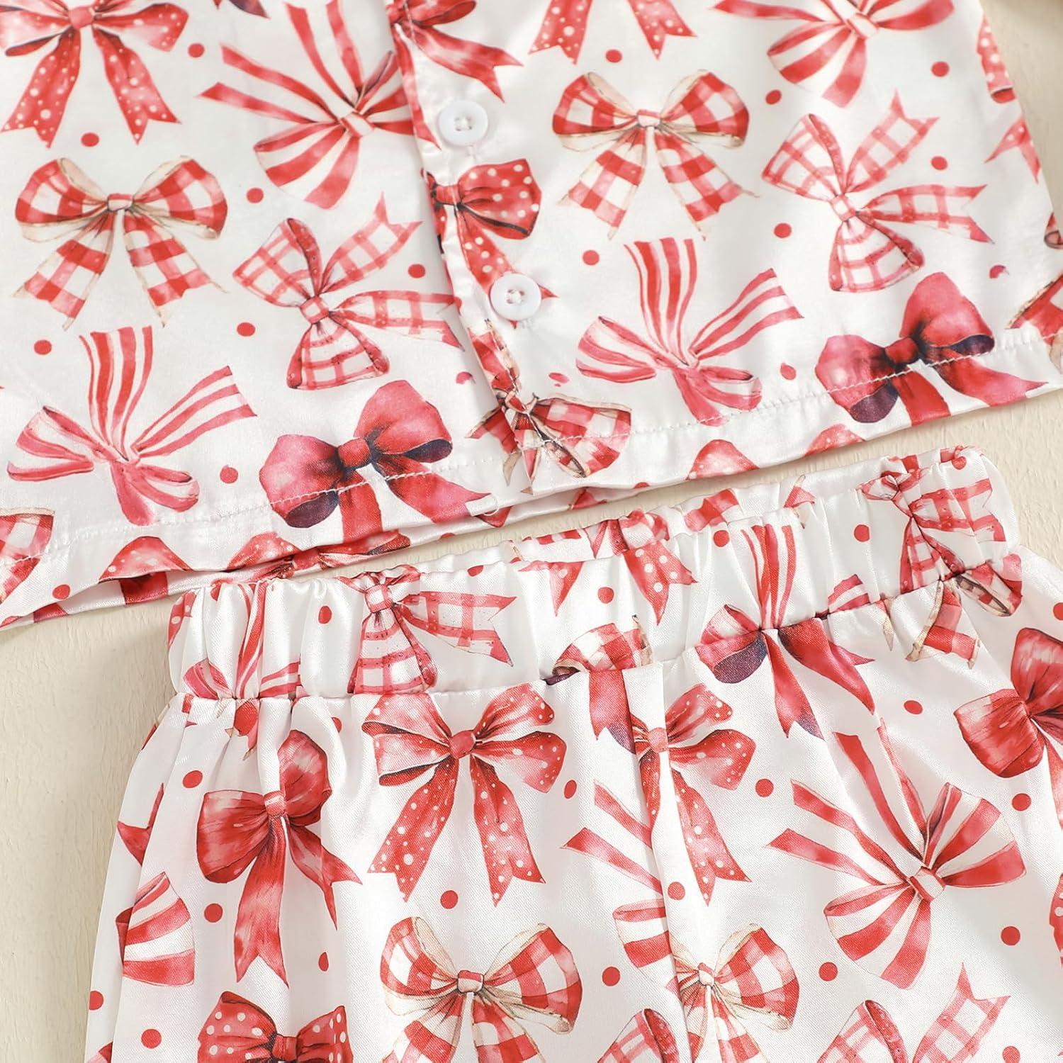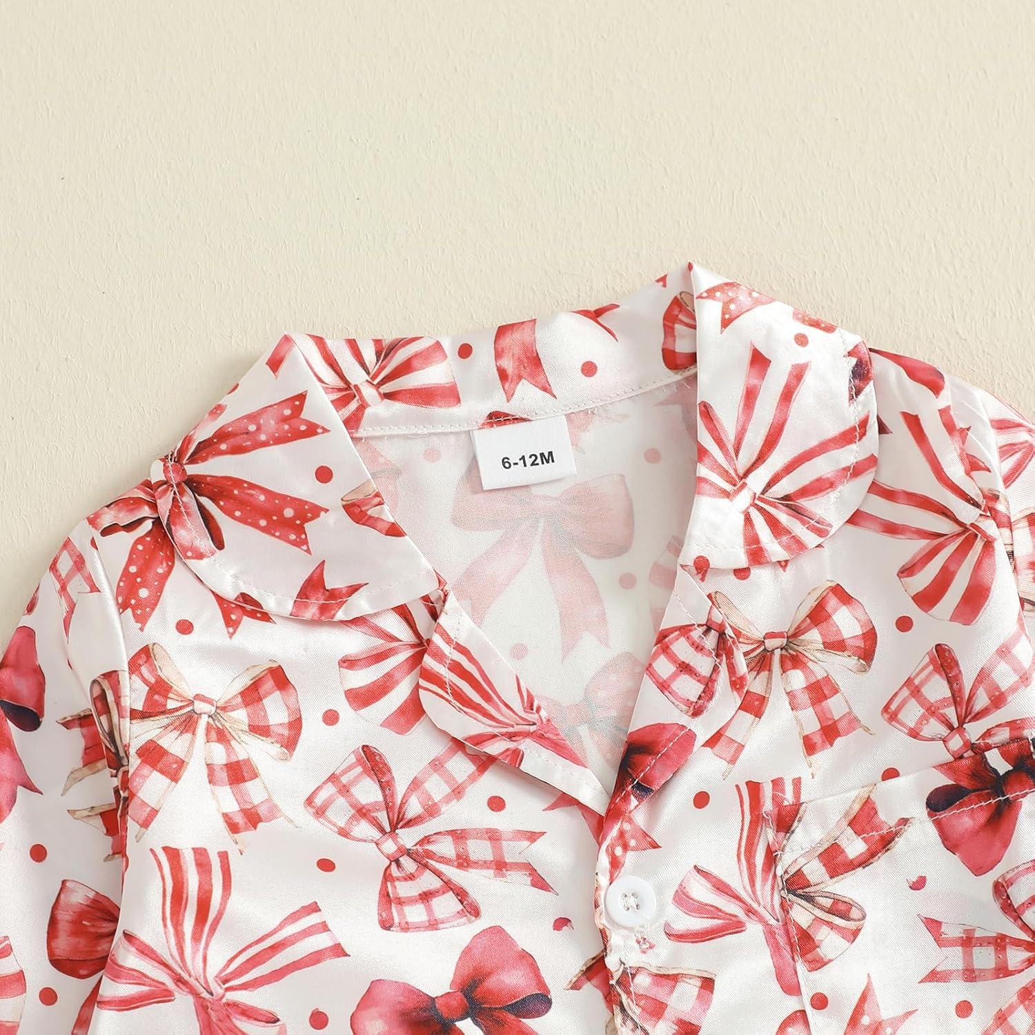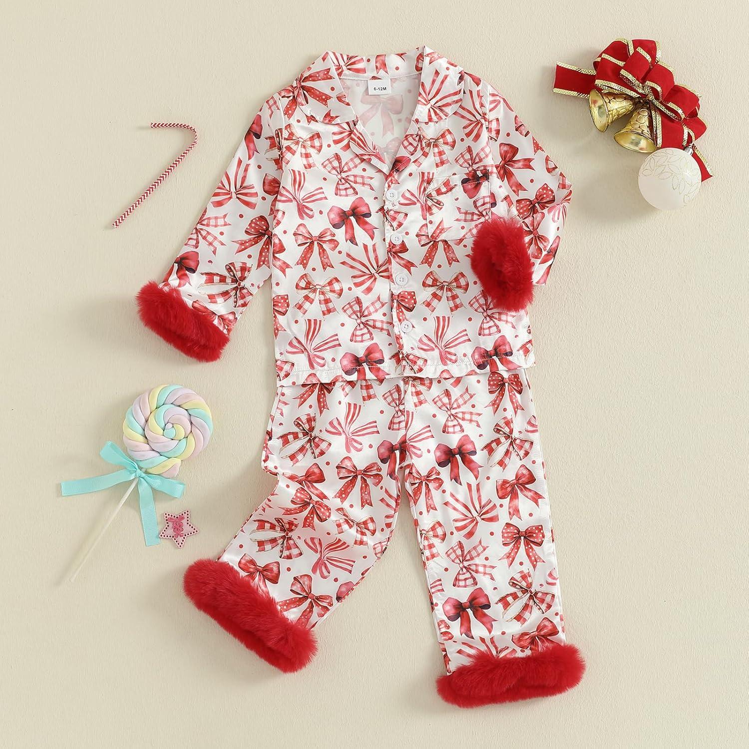 Kuriozud Kids Christmas Pajamas Toddler Girl Santa Feather Trim Button Down Tops Pants Girls Bow Sleepwear Silk Satin Pjs Set(Colorful Bow Red)