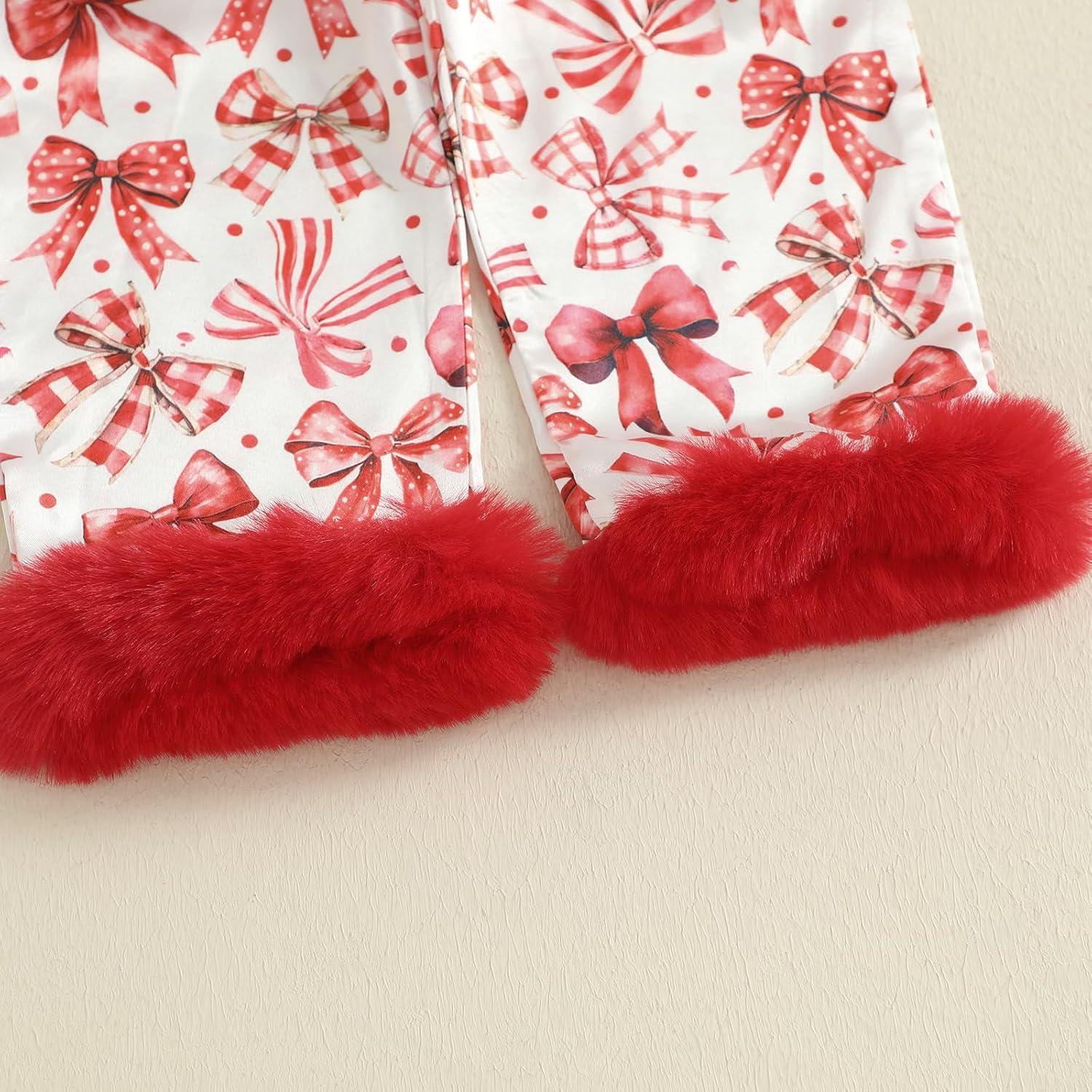 Kuriozud Kids Christmas Pajamas Toddler Girl Santa Feather Trim Button Down Tops Pants Girls Bow Sleepwear Silk Satin Pjs Set(Z Bow Red)