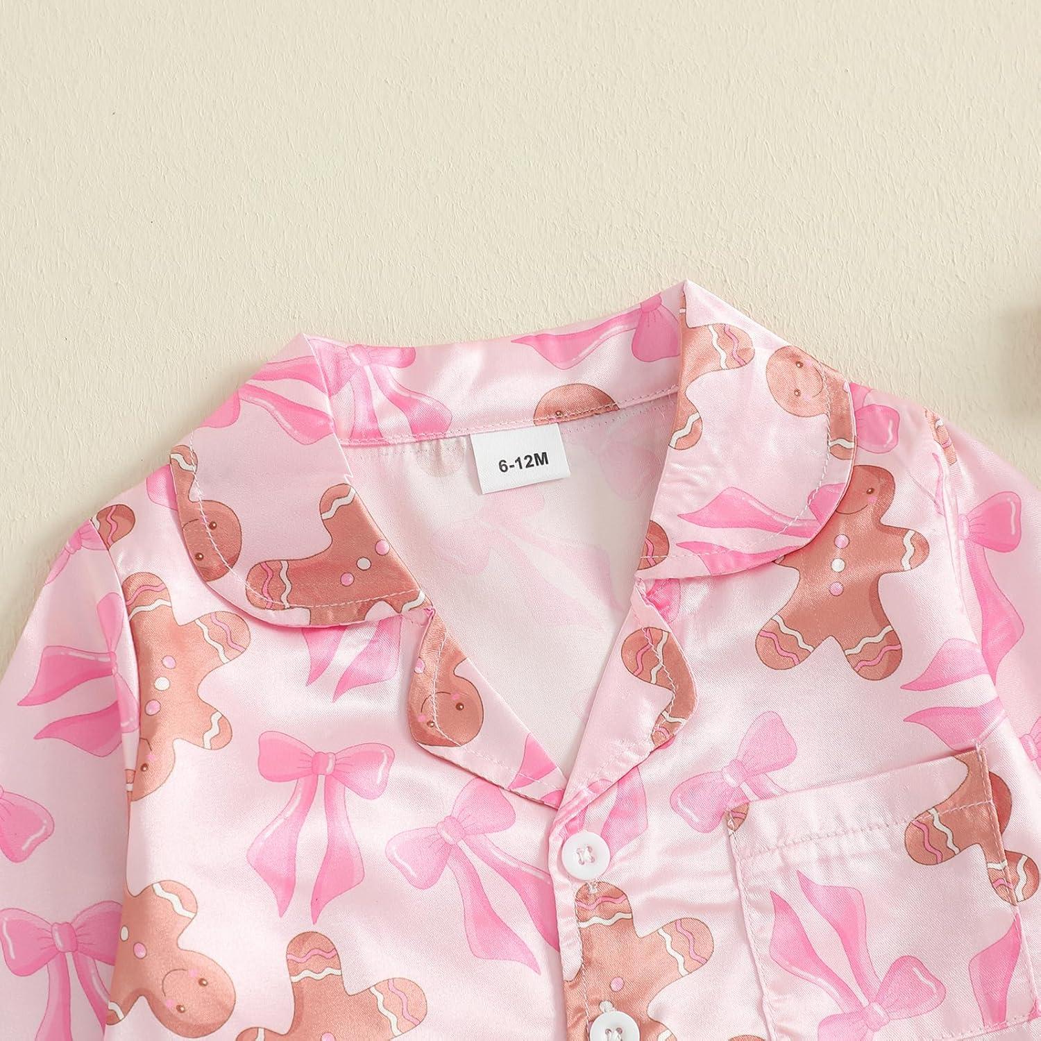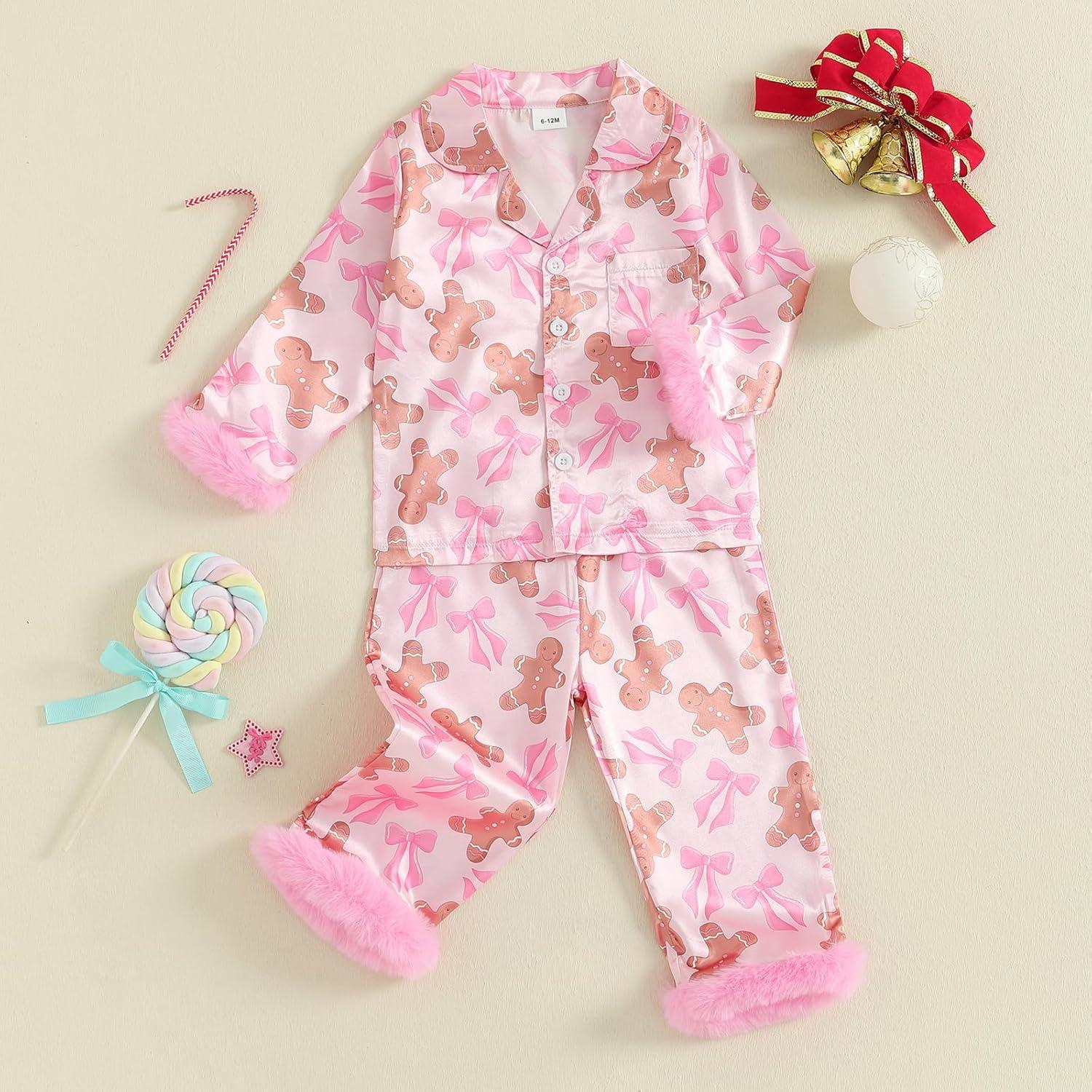 Kuriozud Kids Christmas Pajamas Toddler Girl Santa Feather Trim Button Down Tops Pants Girls Bow Sleepwear Silk Satin Pjs Set(Z Gingerbread Man Pink)