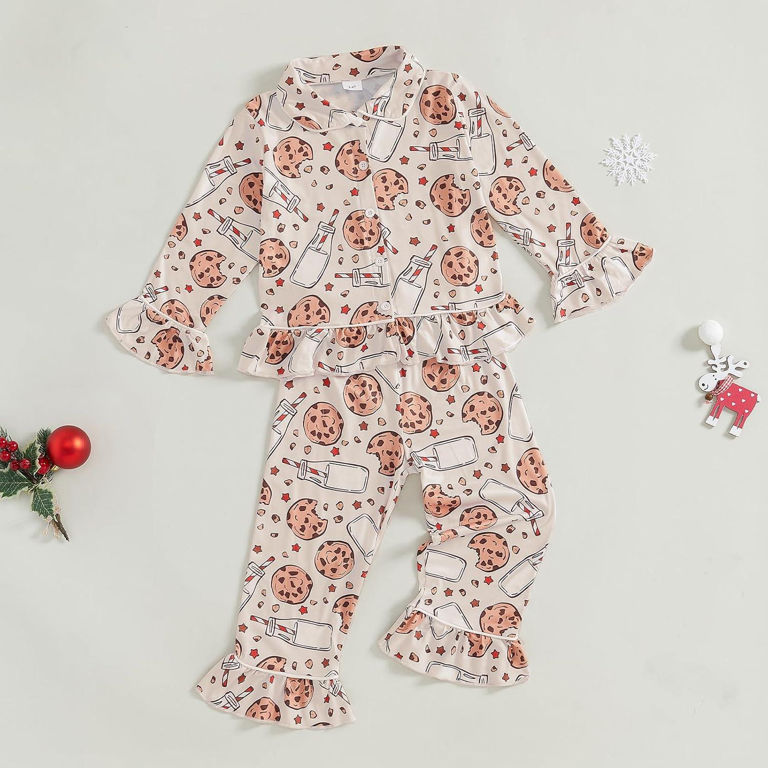 Kuriozud Toddler Girl Christmas Silk Pajamas Ruffle Button Down 2 Piece Pajama Set Kids Little Girls Pjs Nightgown Outfit(Beige Cookie)