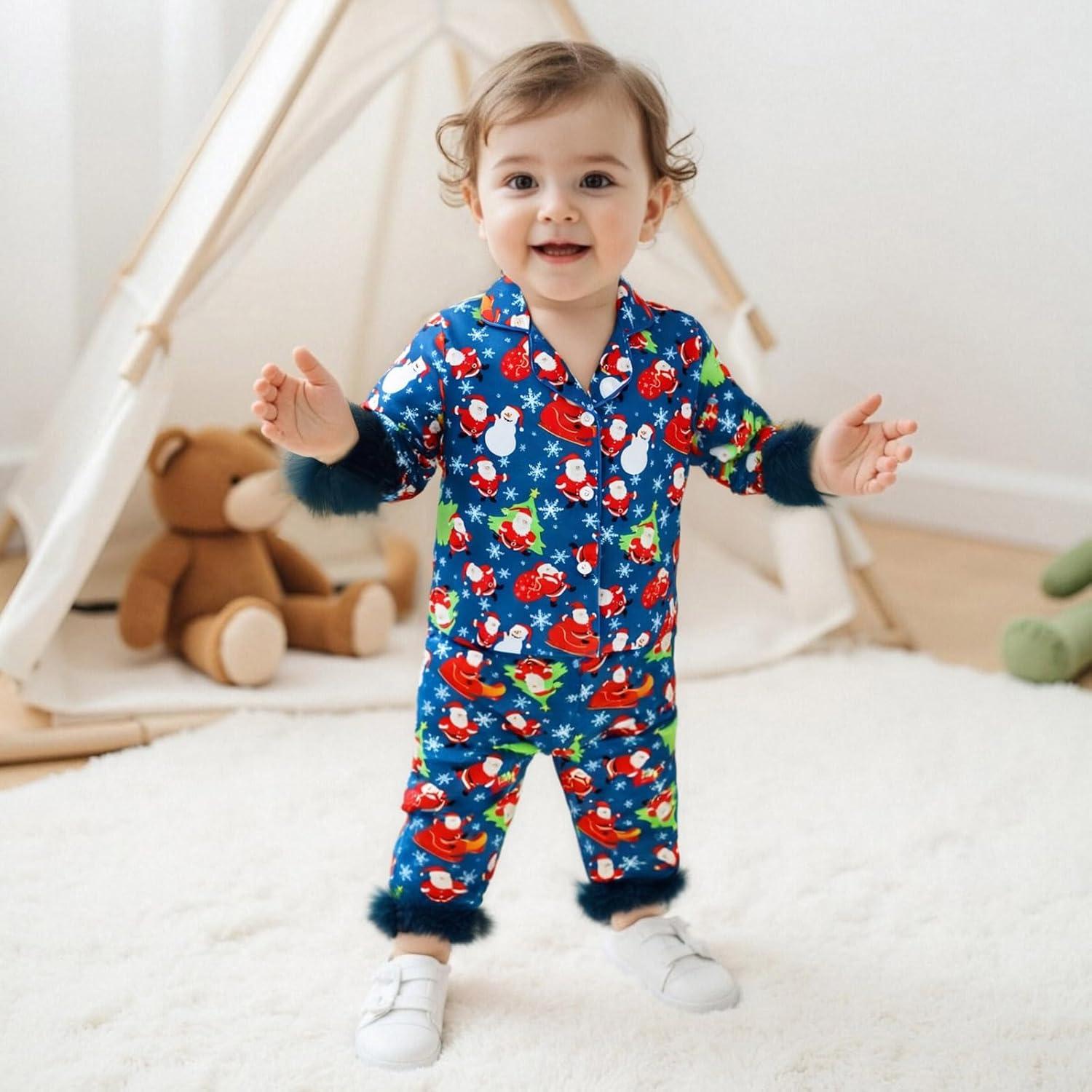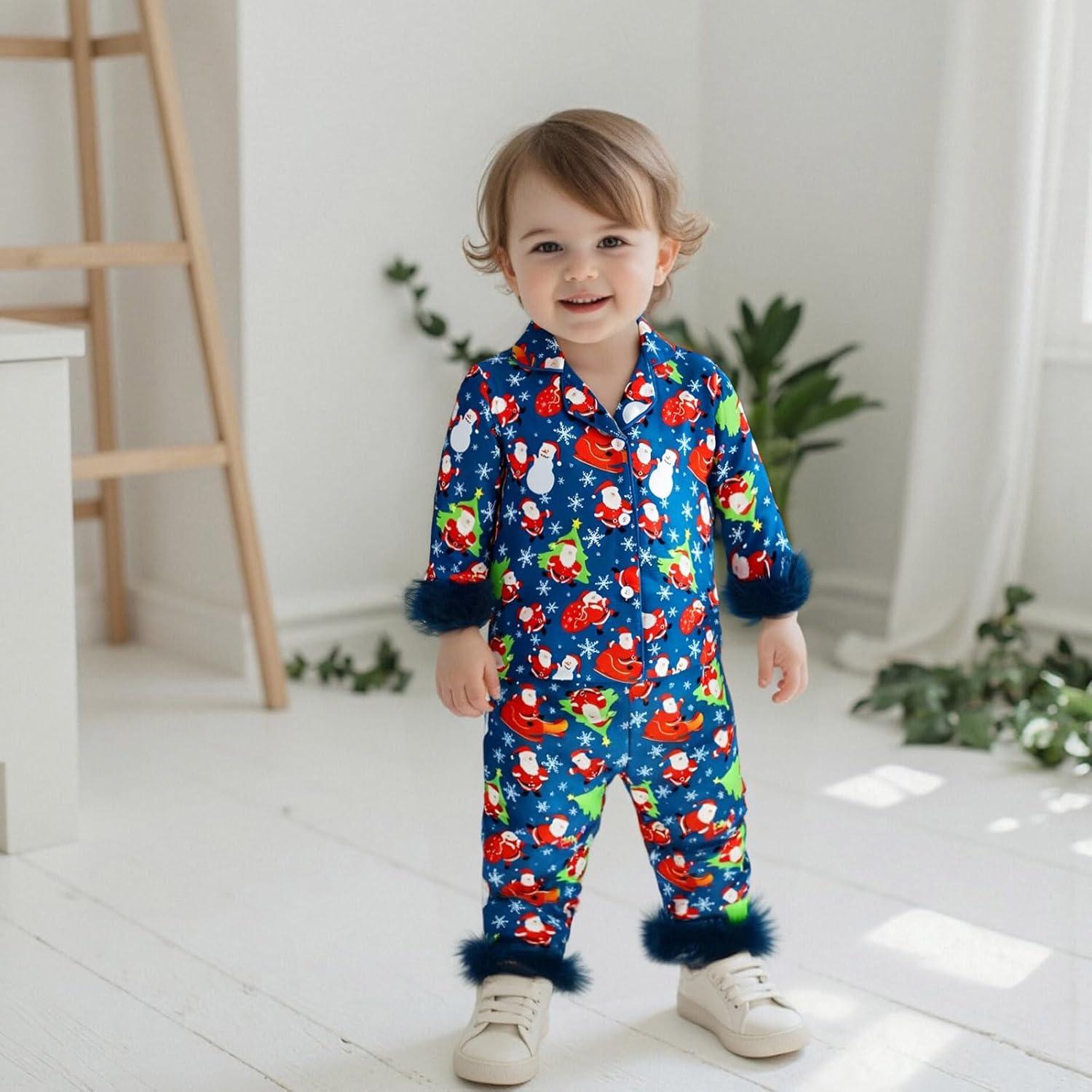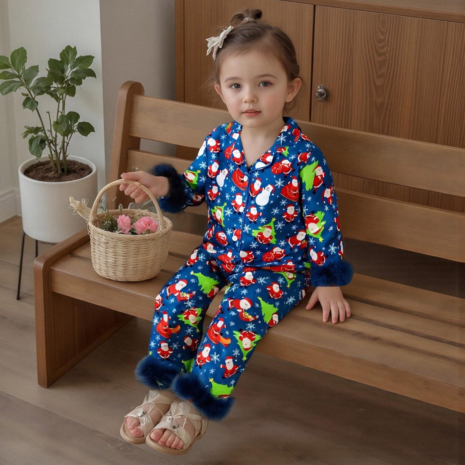 Kuriozud Toddler Girl Christmas Silk Pajamas Ruffle Button Down 2 Piece Pajama Set Kids Little Girls Pjs Nightgown Outfit(Blue Santa Feather Trim)