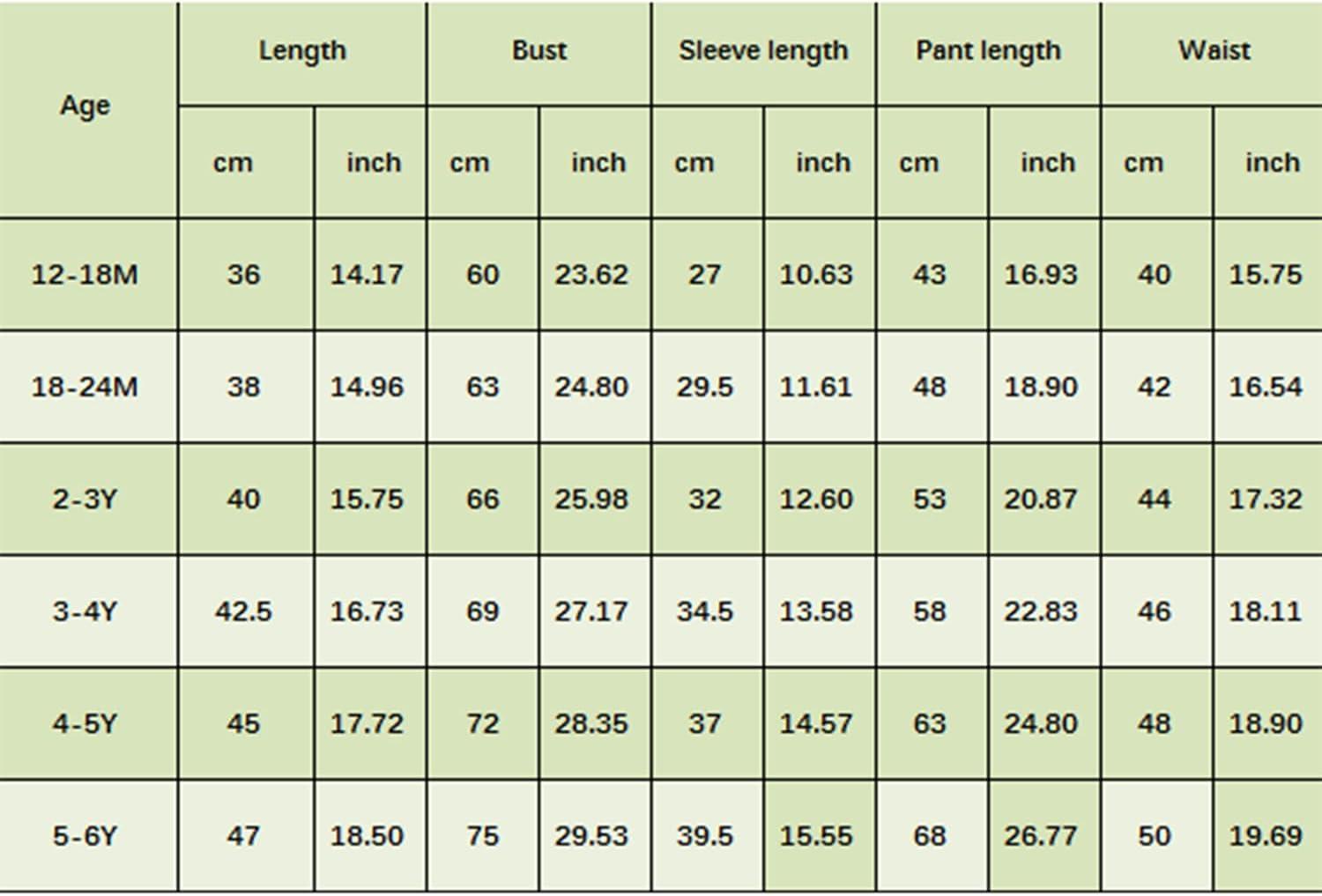 2-3Y Tops Length: 15.75 Bust: 25.98 Sleeve: 12.6 Pants Length: 20.87 Waist: 17.32 Advised Age: 2-3 Years