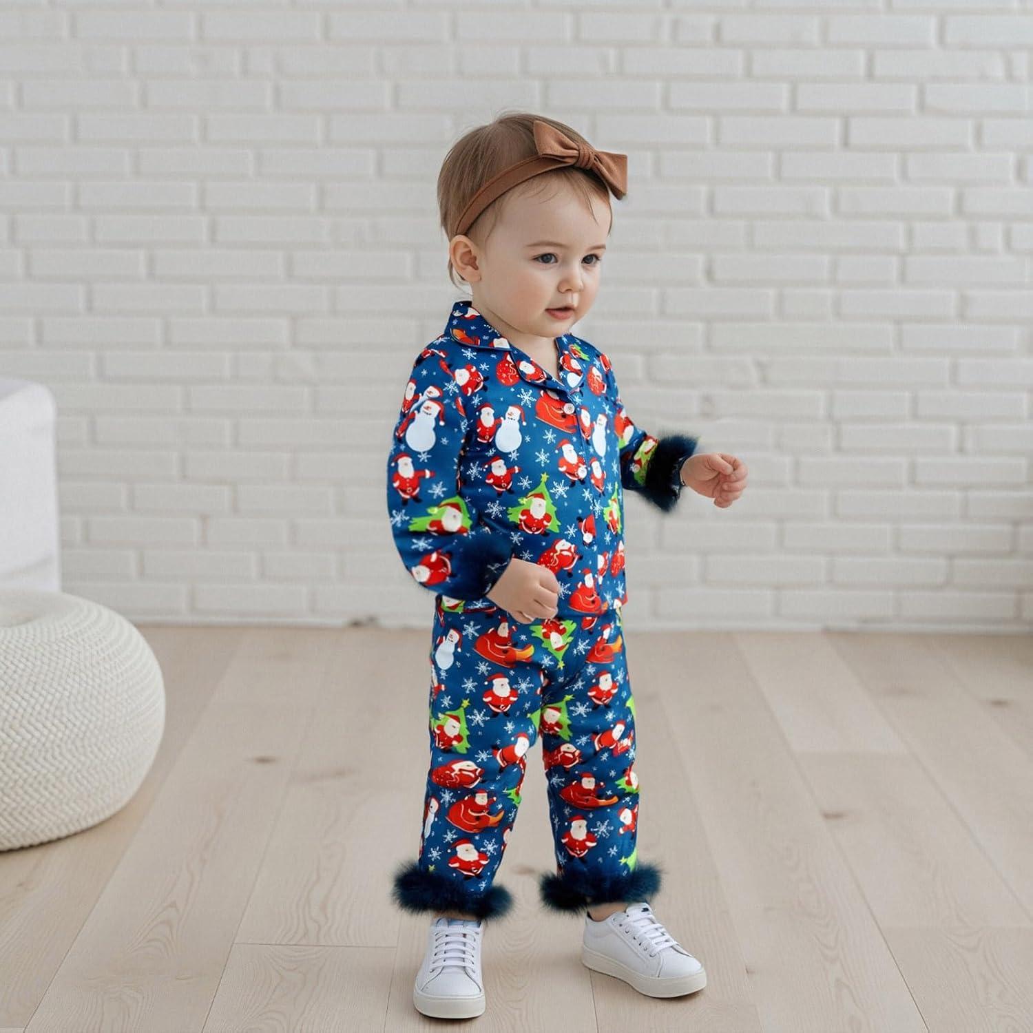 Girls Pajamas Set Feather Trim Christmas Print Button up Long Sleeves Shirt with Elastic Pants for Loungewear Sleepwear