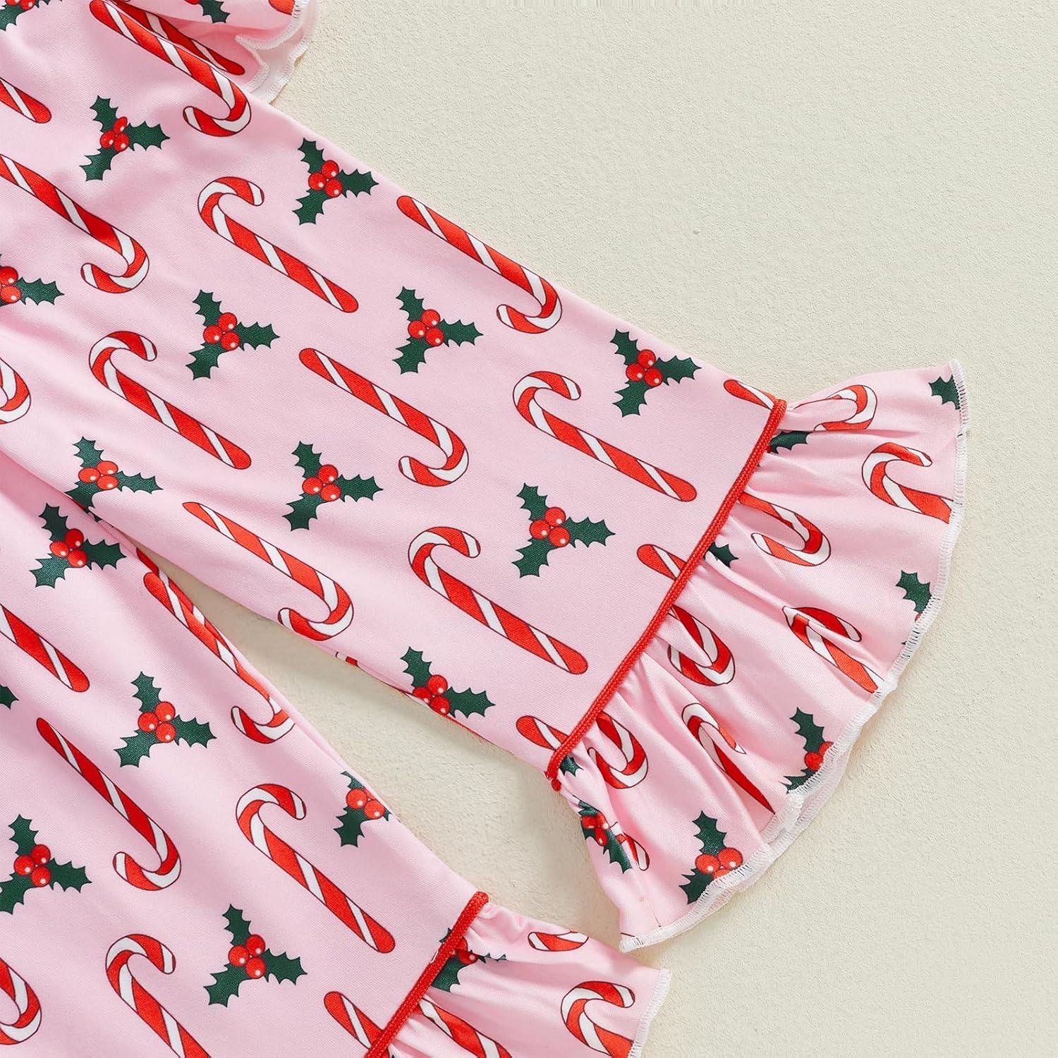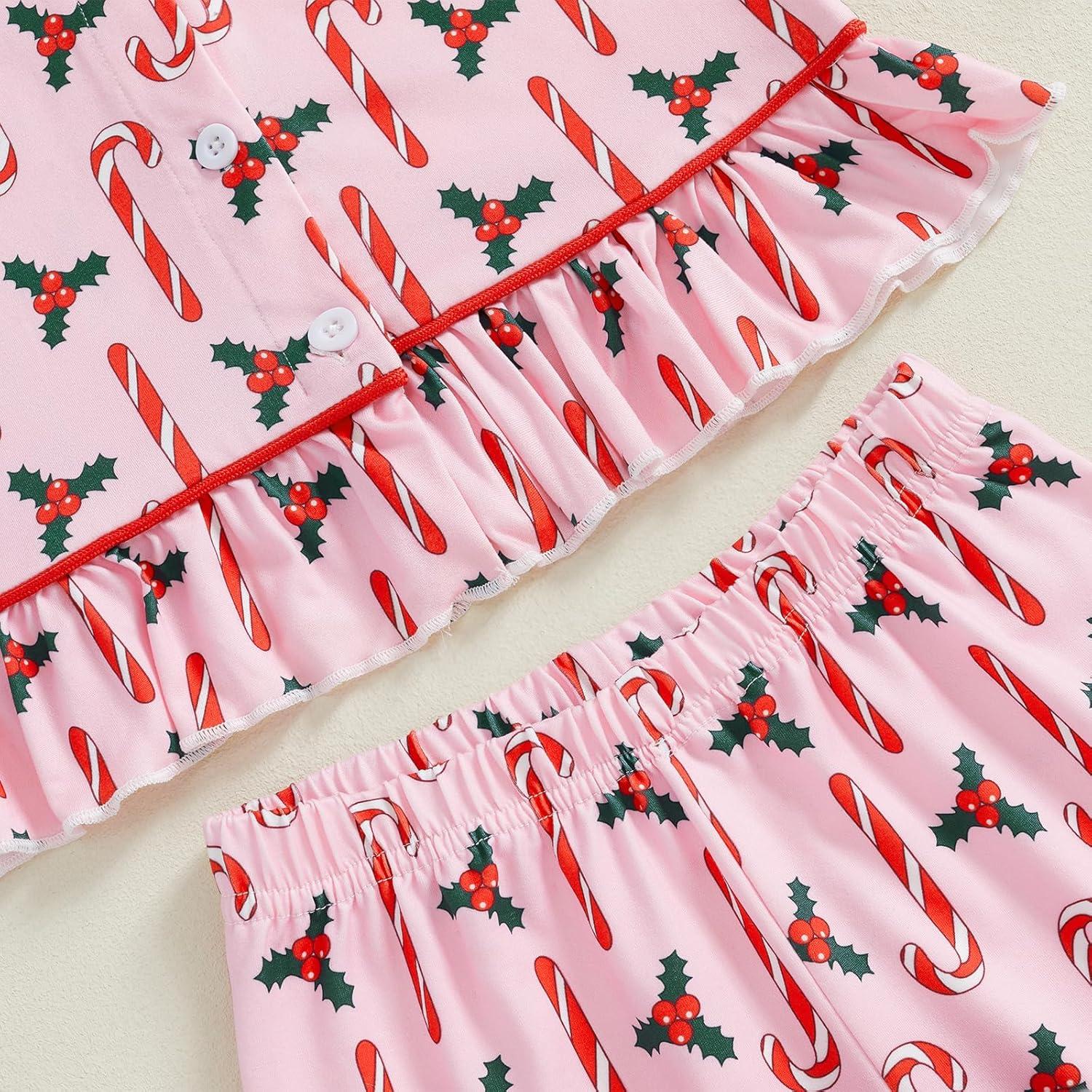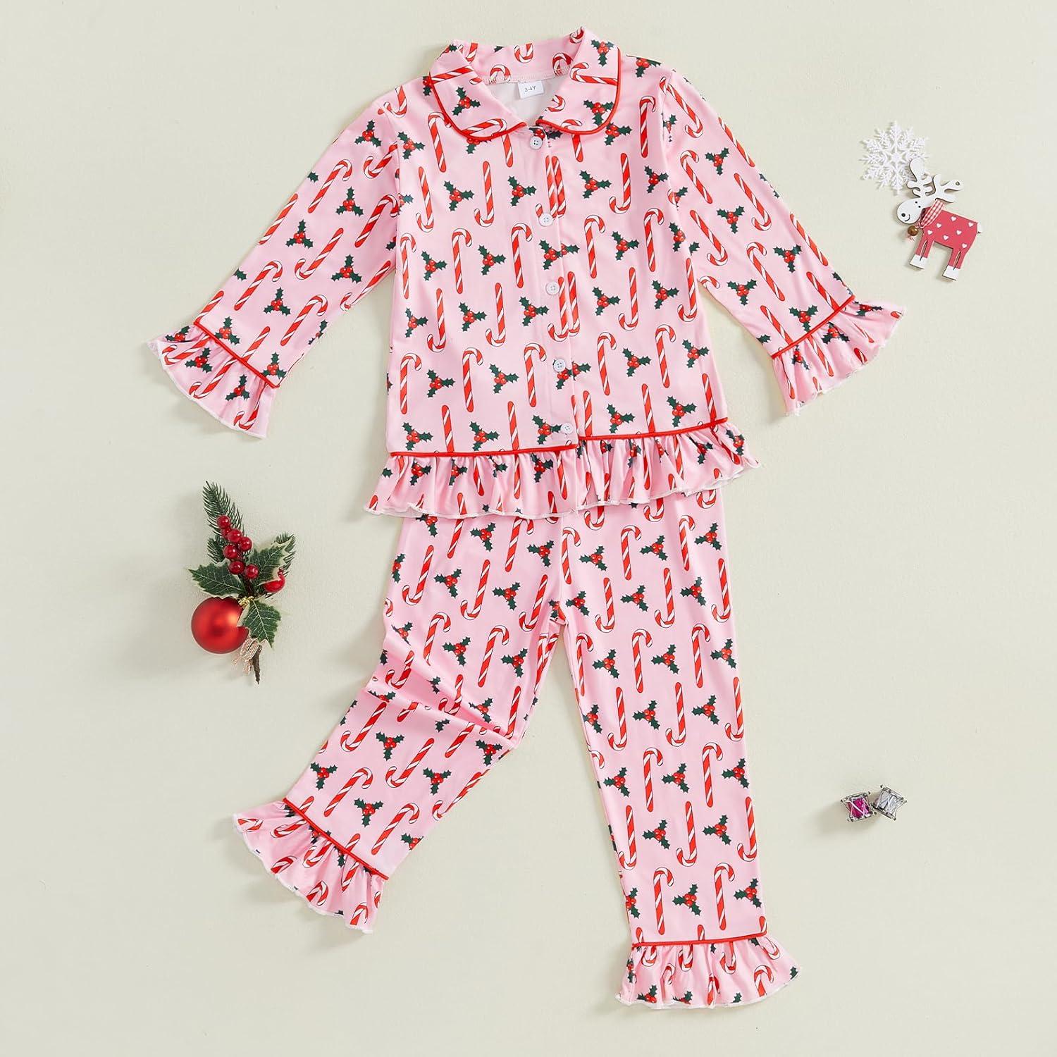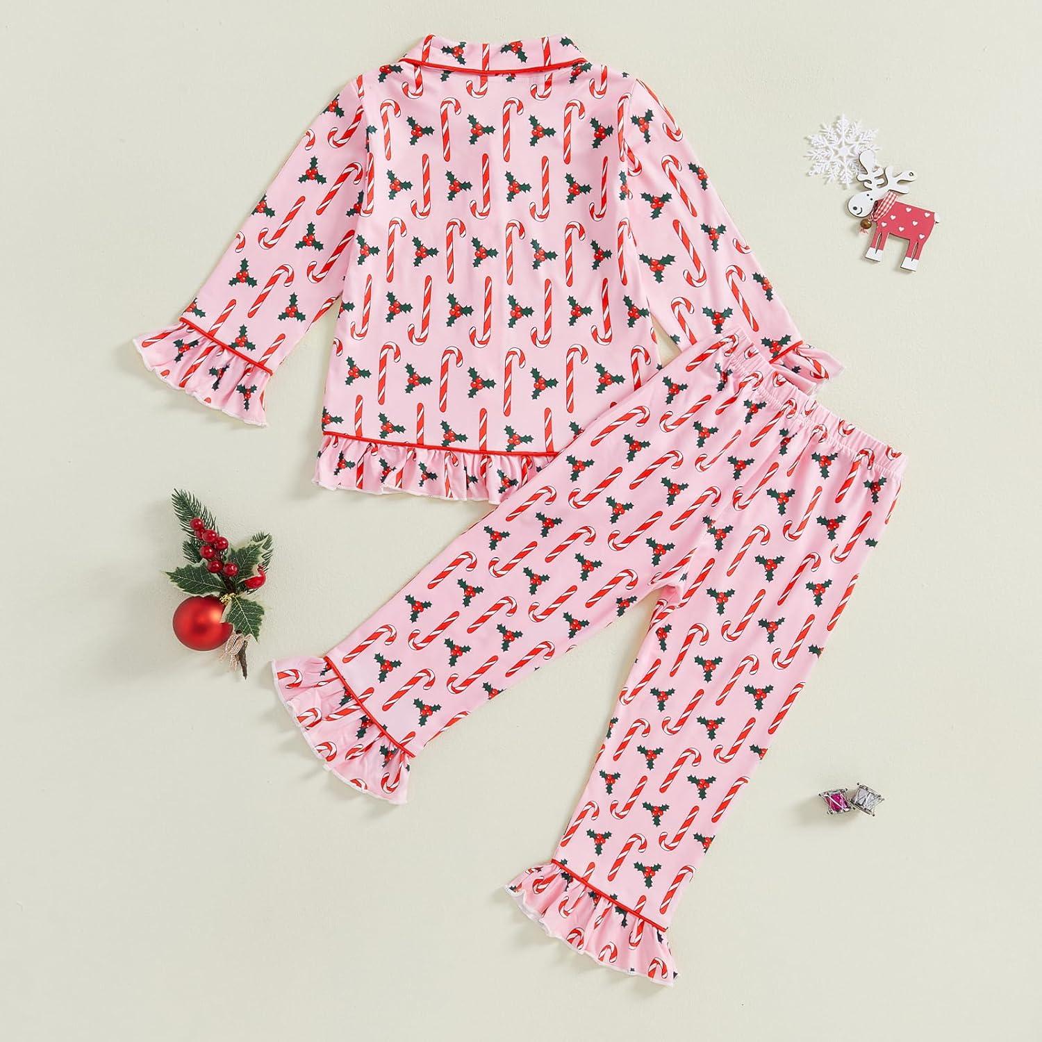 Kuriozud Toddler Girl Christmas Silk Pajamas Ruffle Button Down 2 Piece Pajama Set Kids Little Girls Pjs Nightgown Outfit(Pink Candy Cane)