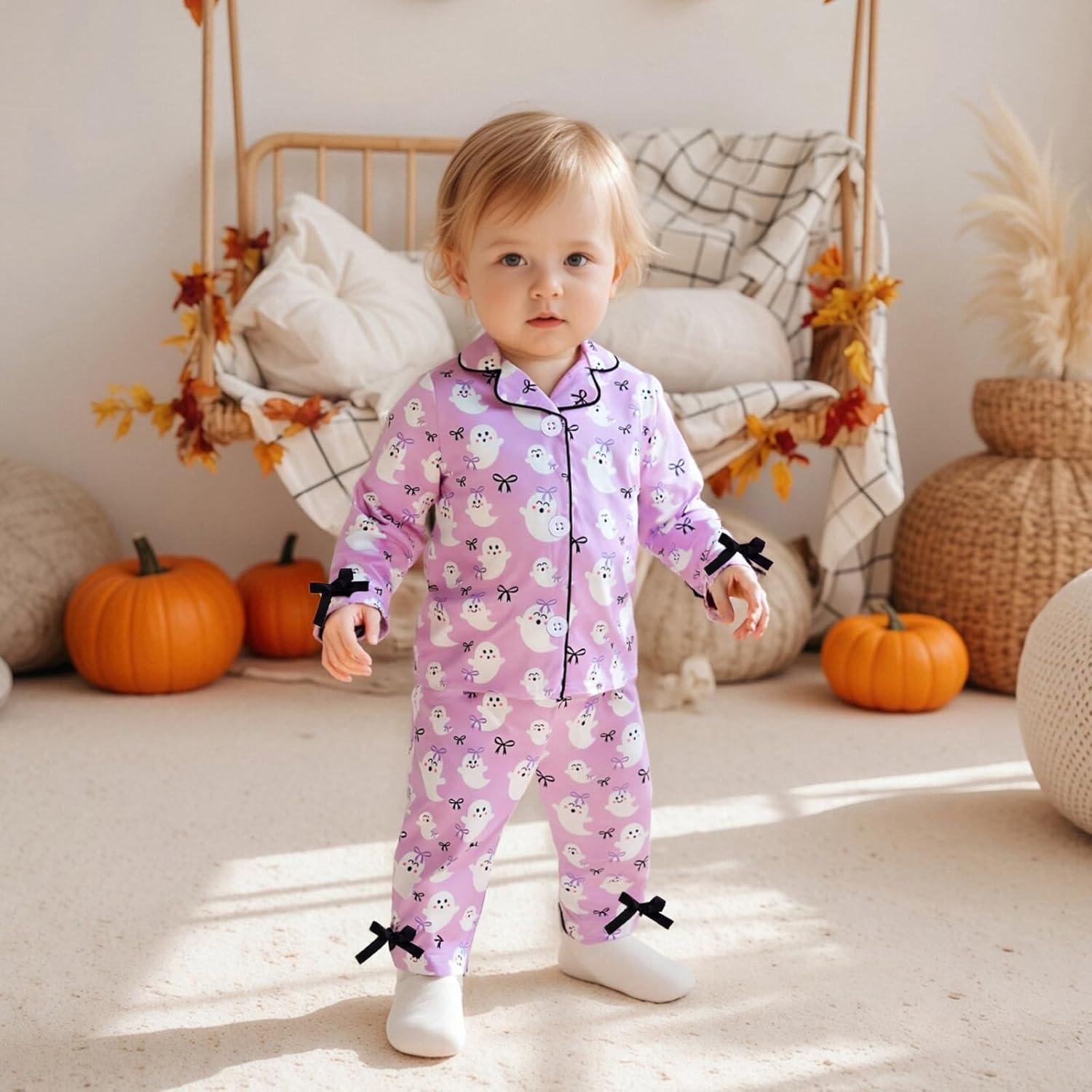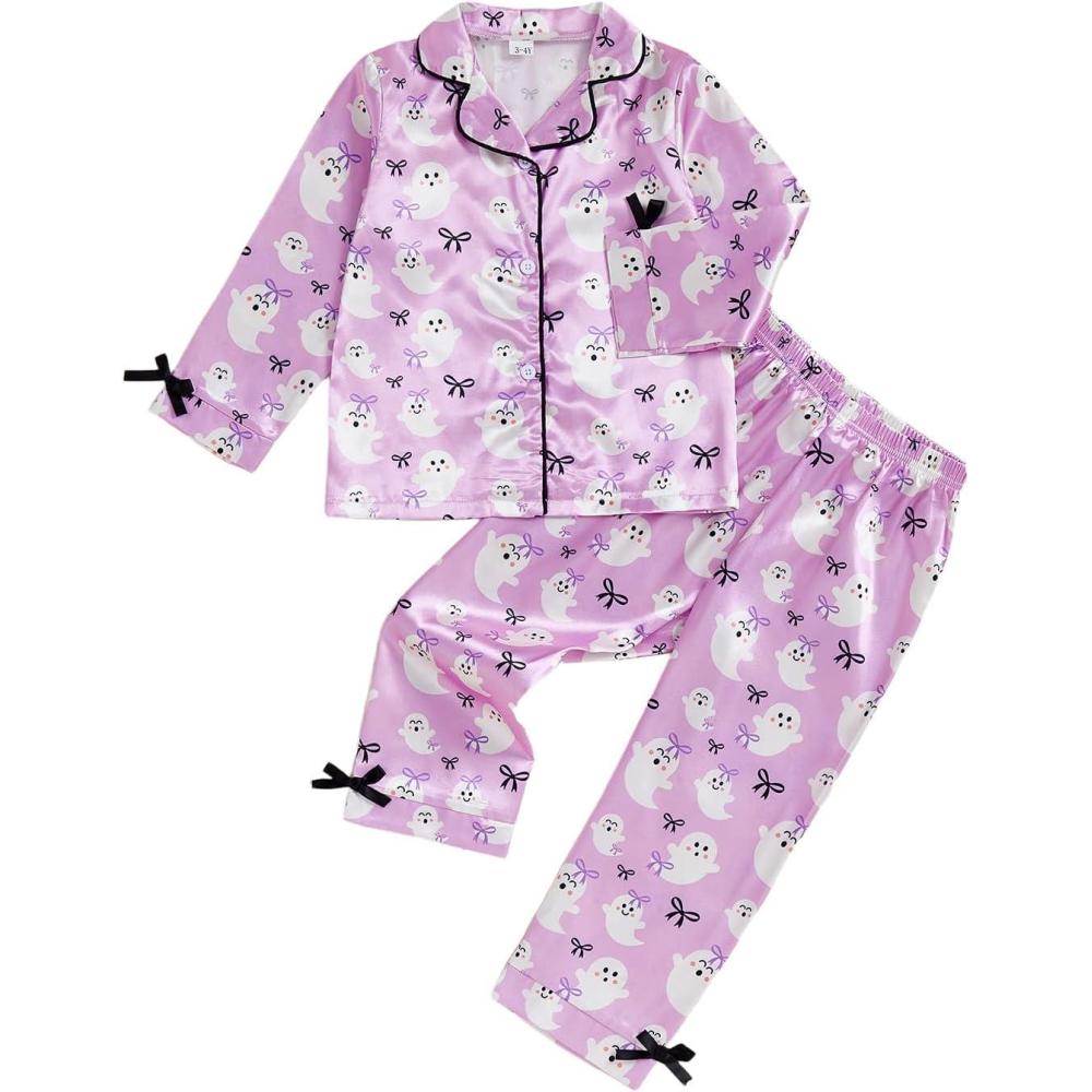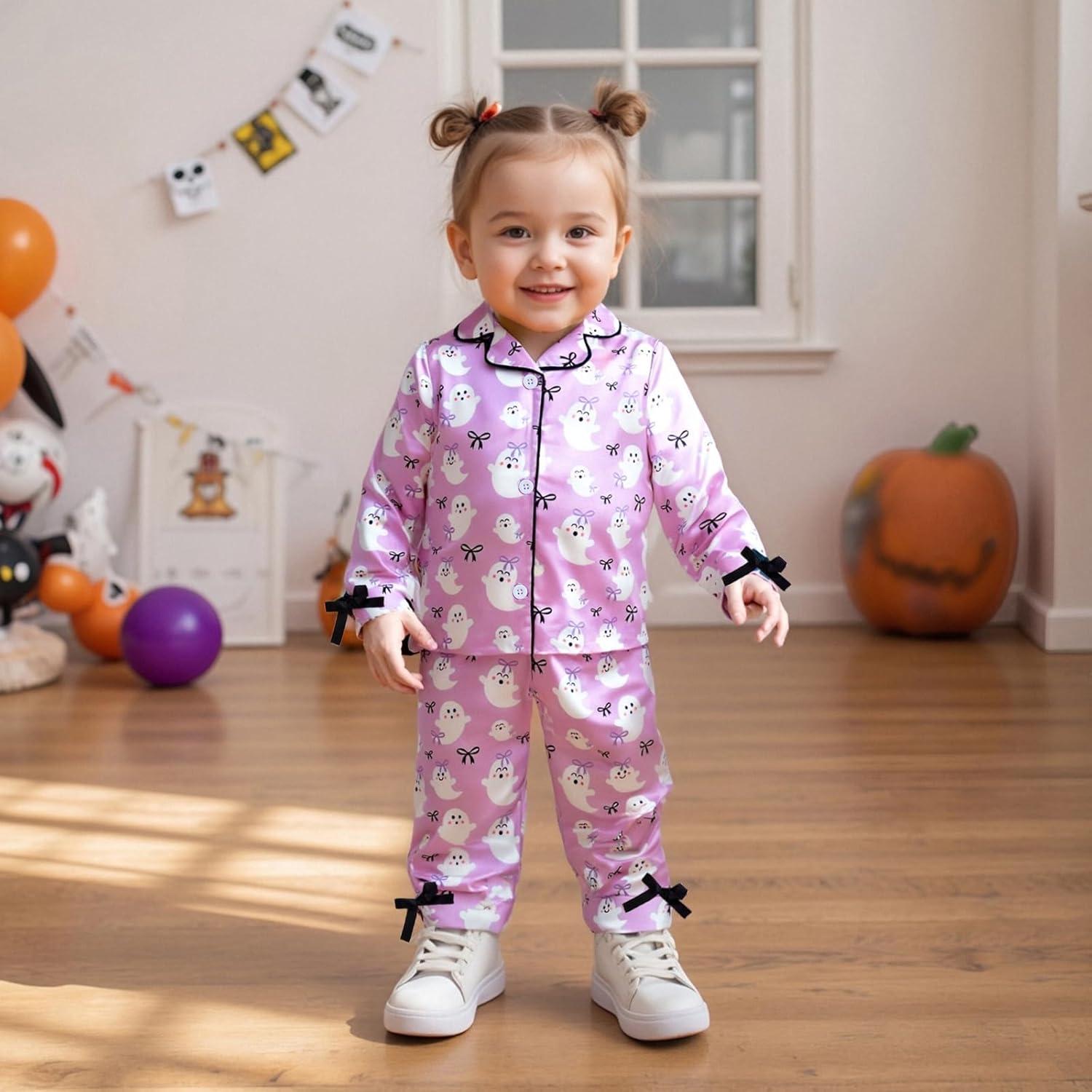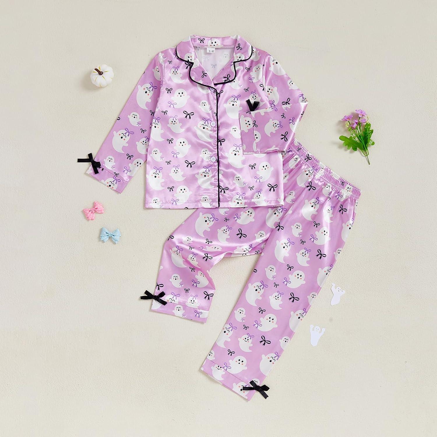Toddler Girl Christmas Satin Pajamas Set Bow Pumpkin Print Lapel Long Sleeve Button Down Tops with Pants Sleepwear