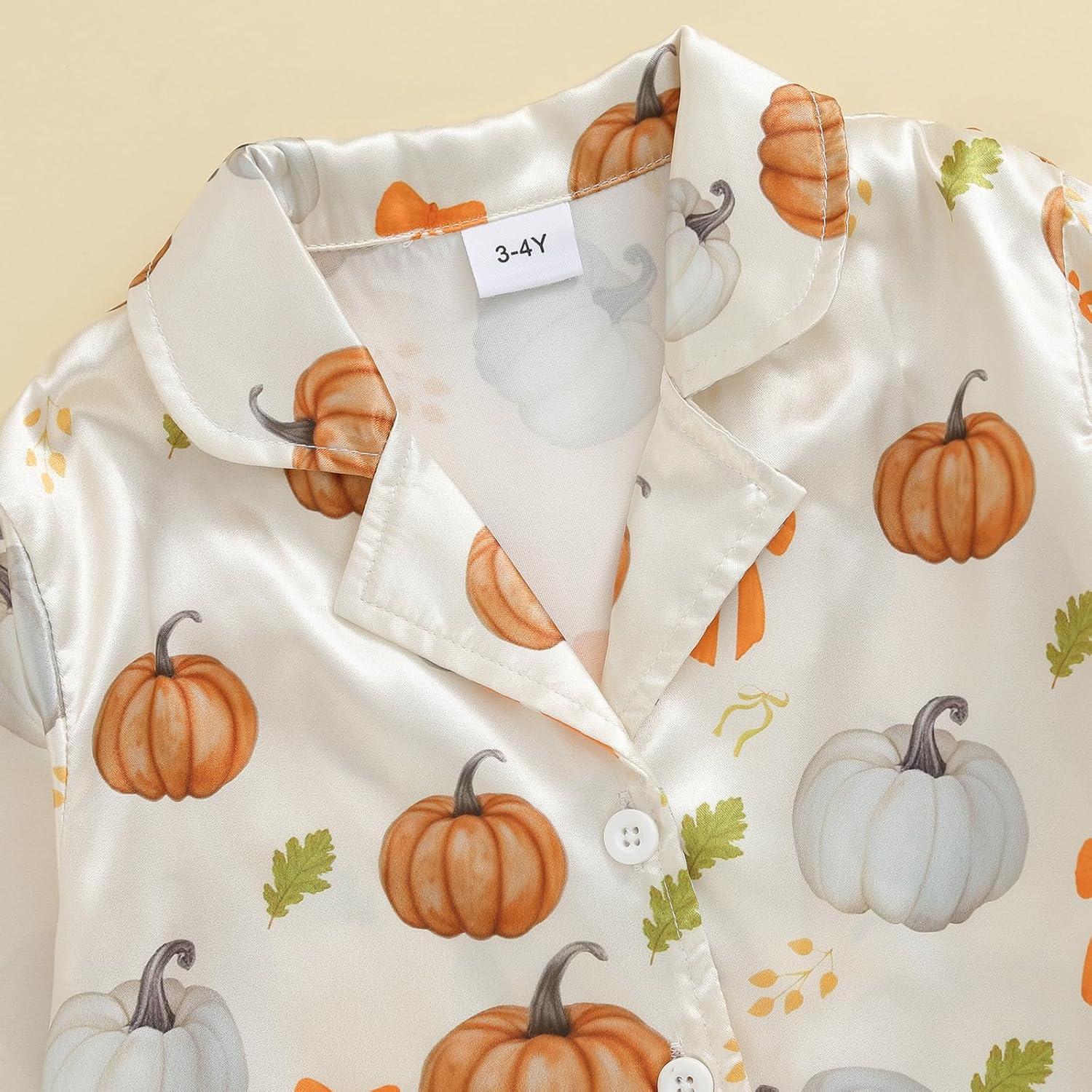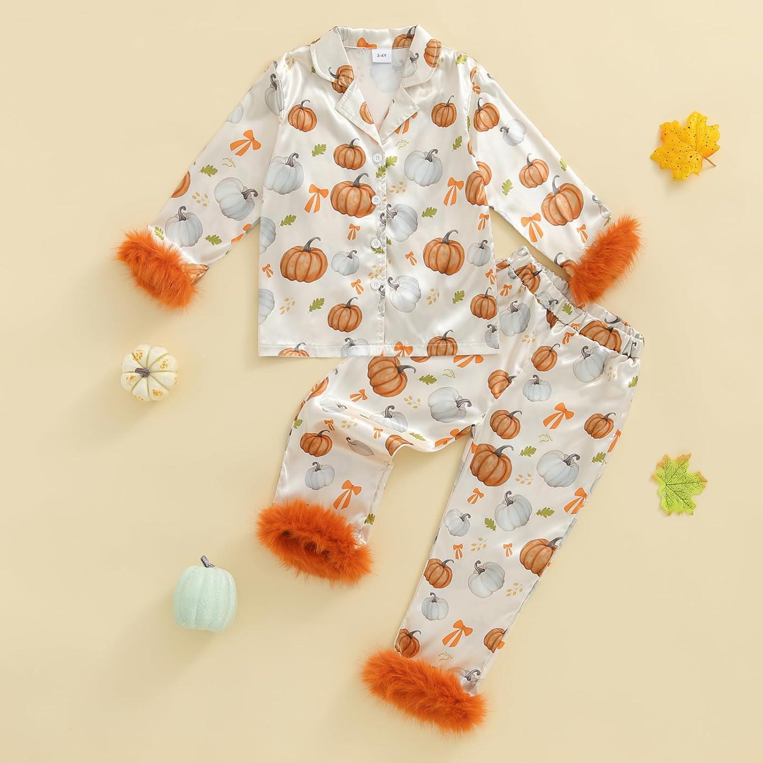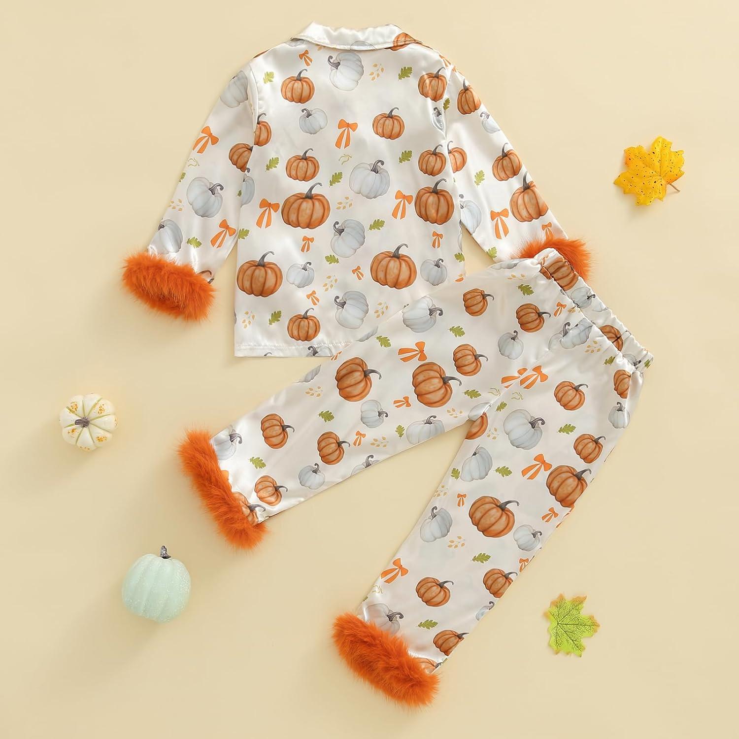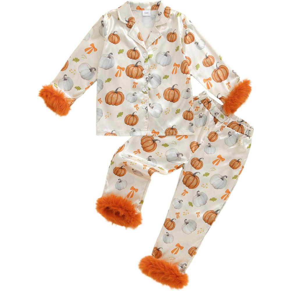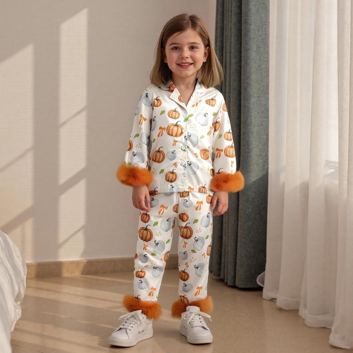 Toddler Girl Christmas Satin Pajamas Set Bow Pumpkin Print Lapel Long Sleeve Button Down Tops with Pants Sleepwear