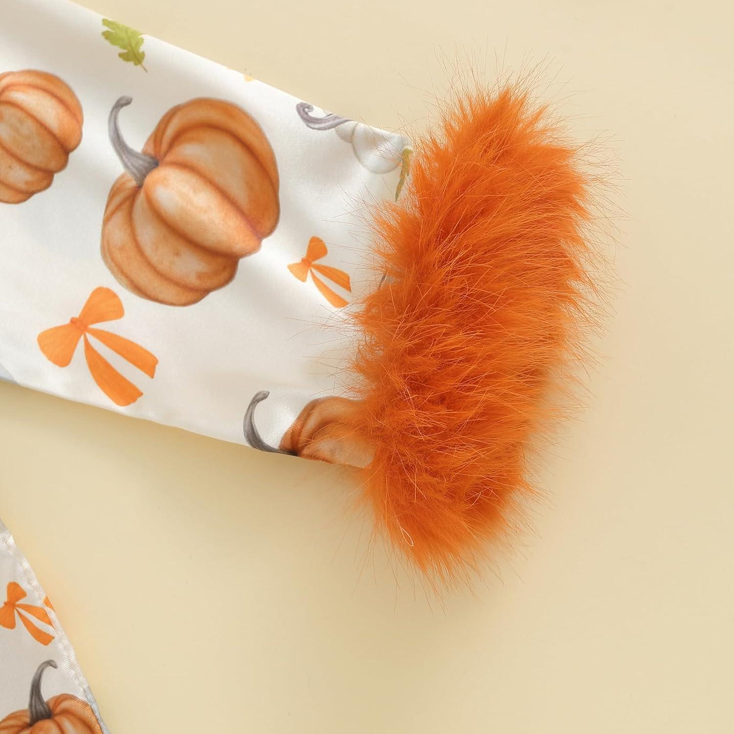 Kuriozud Toddler Kids Little Girls Halloween Satin Pajamas Pumpkin Feather Trim Sleeve Button Down Sleepwear Pjs Set 1-9 Y(Bow Pumpkin-apricot)