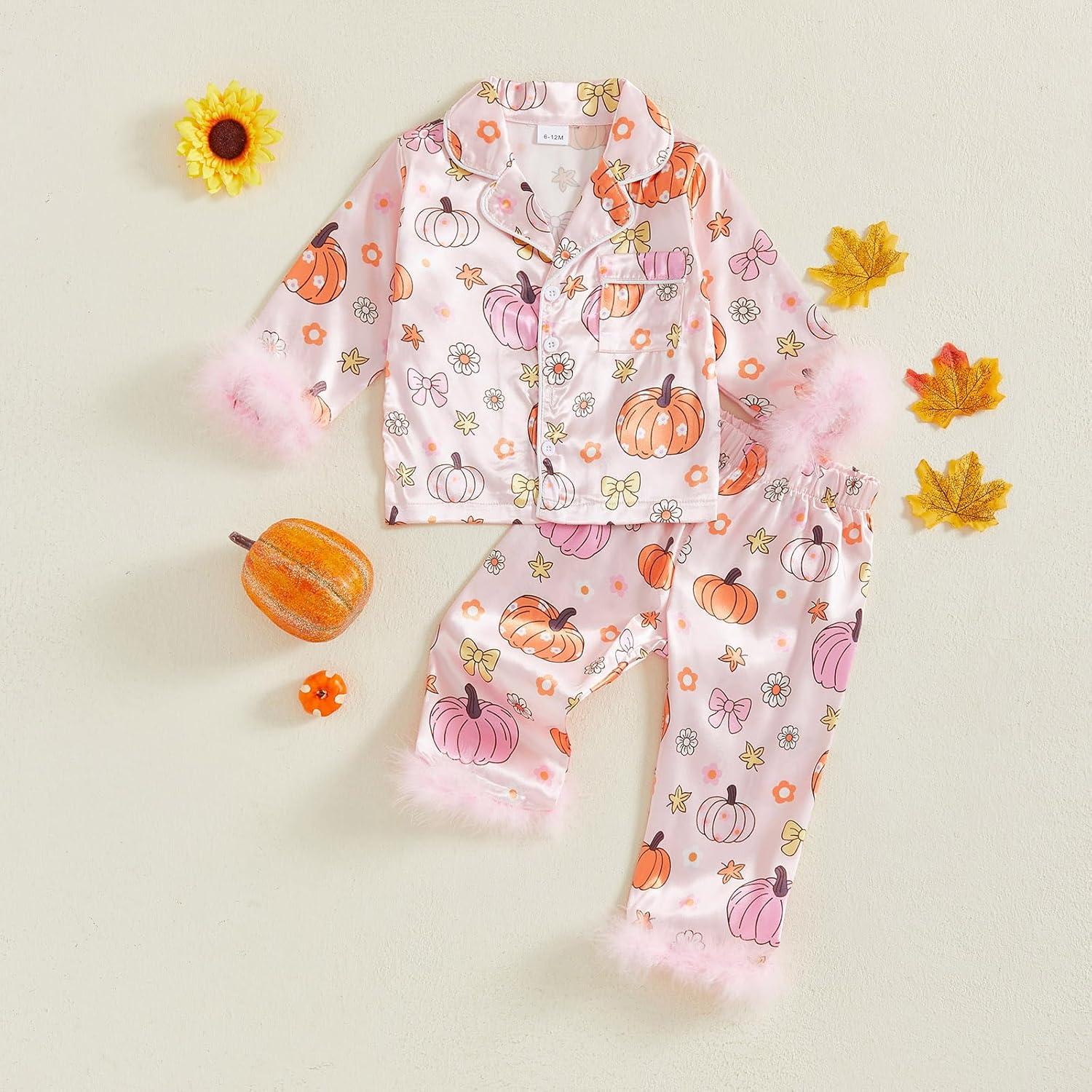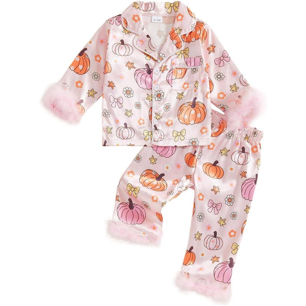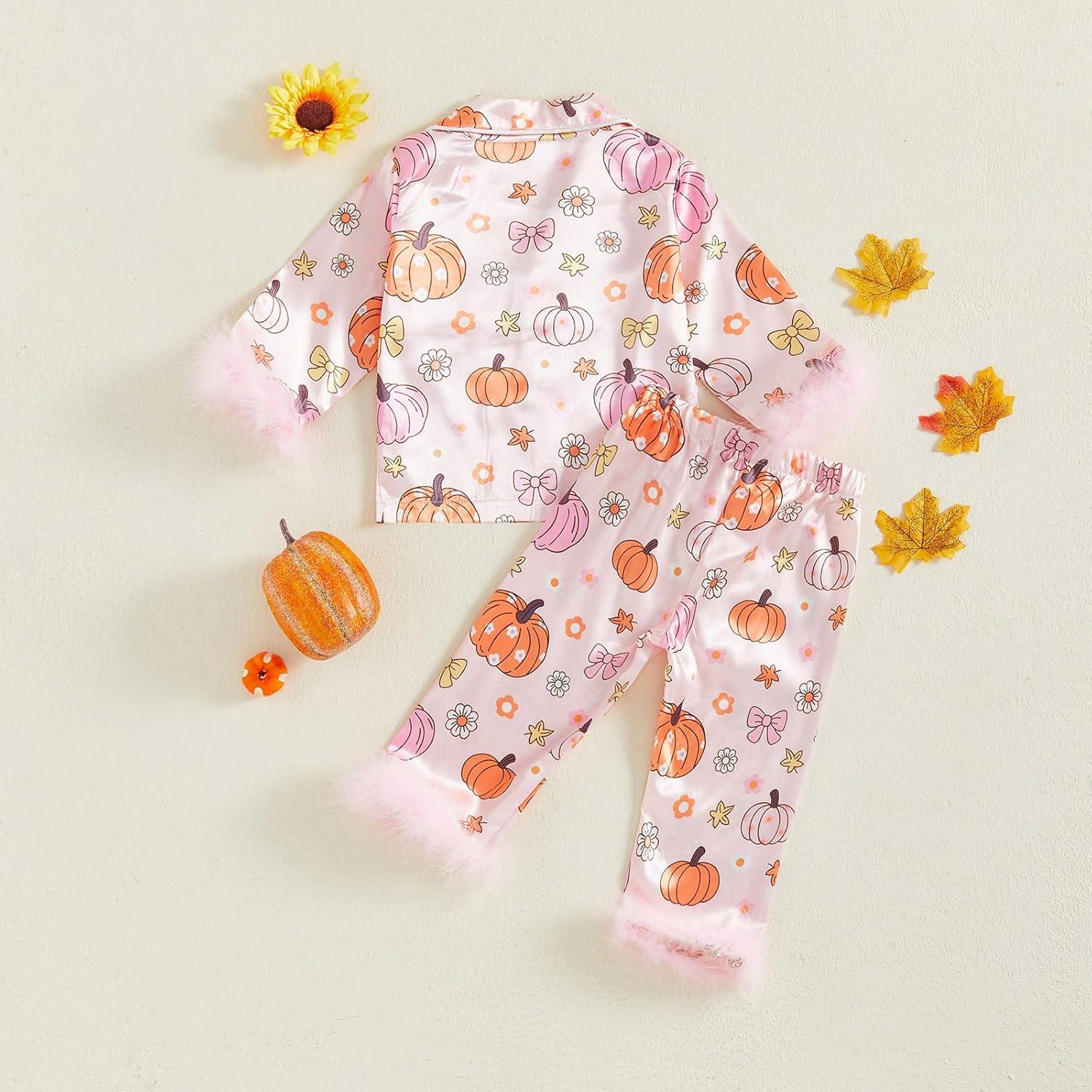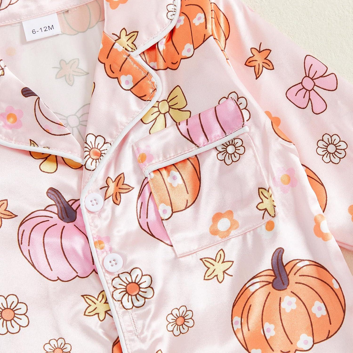 Toddler Girl Christmas Satin Pajamas Set Bow Pumpkin Print Lapel Long Sleeve Button Down Tops with Pants Sleepwear
