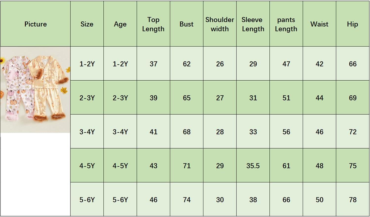 5-6Y Top Length: 18.90 Bust: 29.92 Shoulder: 11.42 Sleeve Length: 14.57 Waist: 19.69 Pants Length: 25.59 Hip: 29.92 Advised Age: 5-6 Years